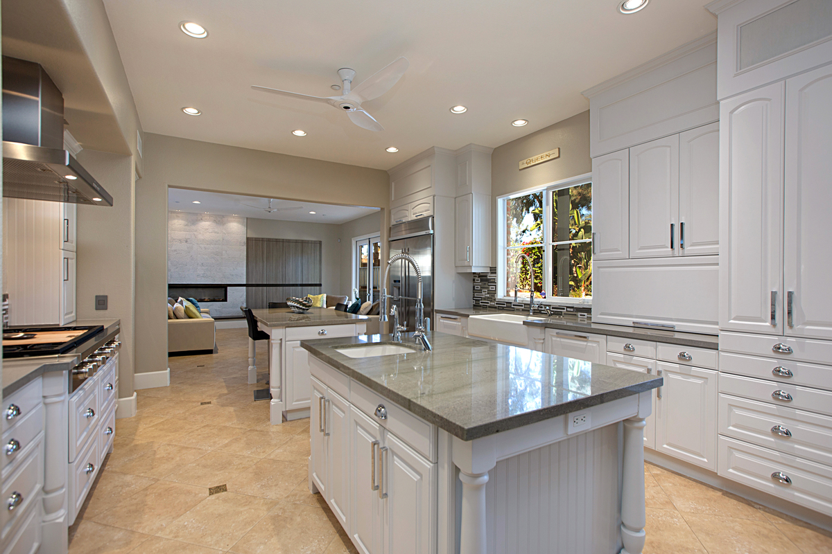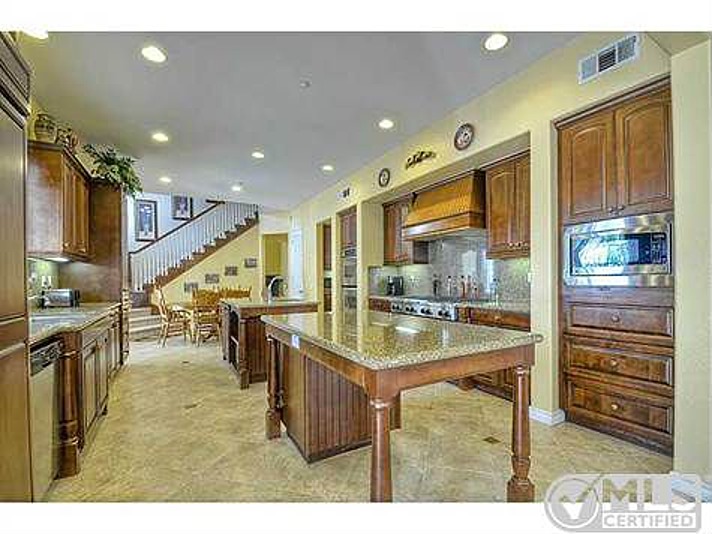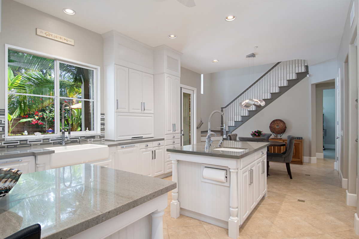 - Custom kitchen with dual islands, quartz counters, vegetable sink, hidden appliance cabinet, custom pantry, butler’s pantry, and breakfast nook.