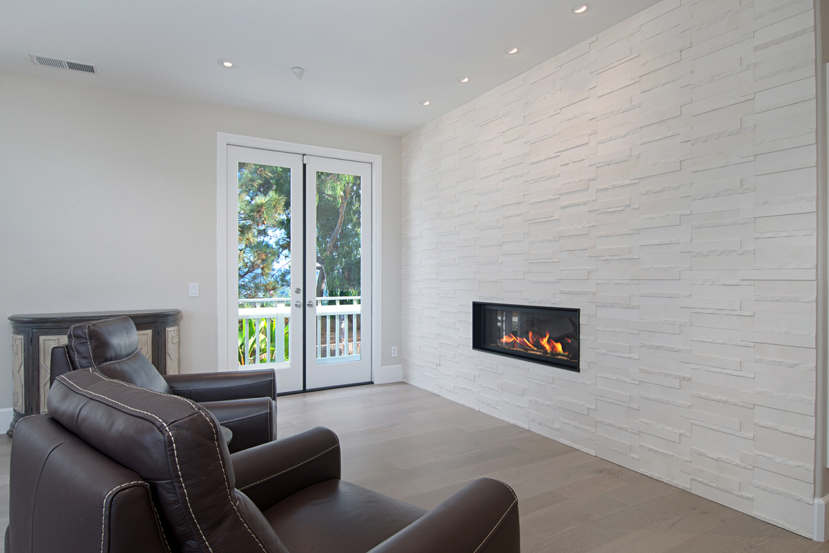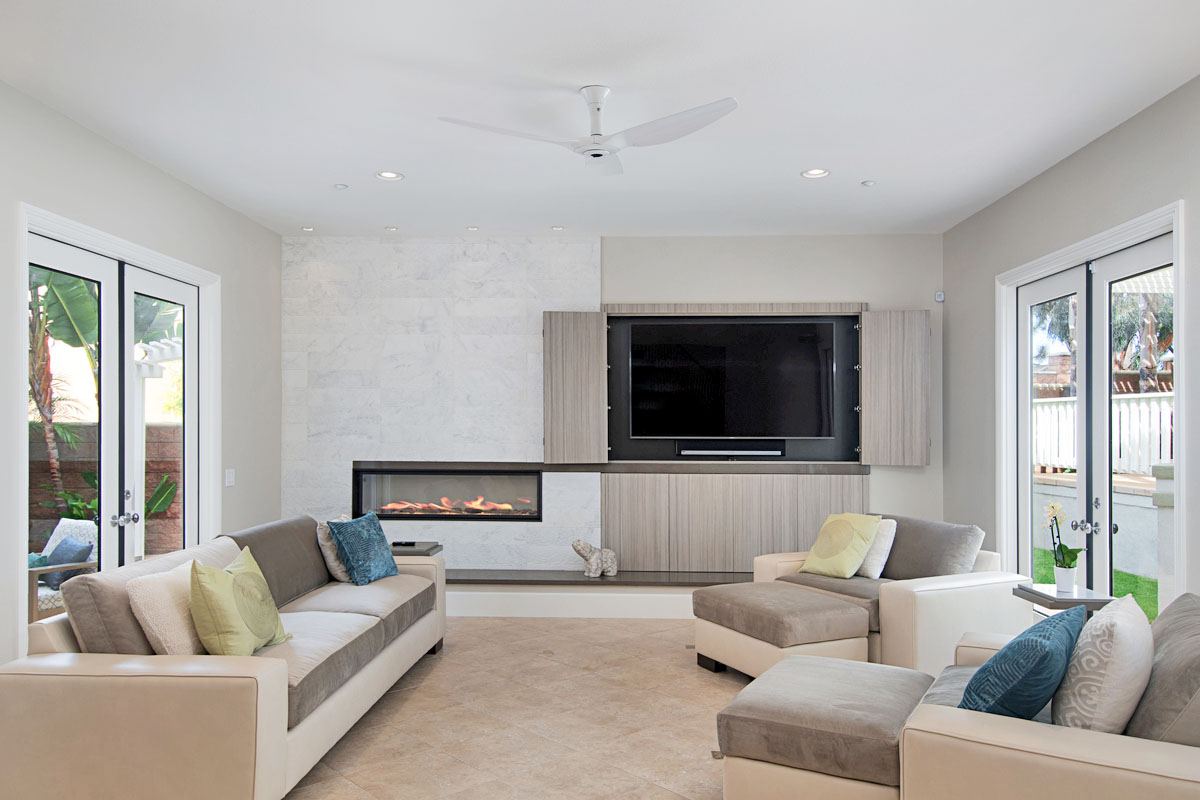 - Family room with combed marble feature wall, 61” gas fireplace, and sleek custom cabinetry.