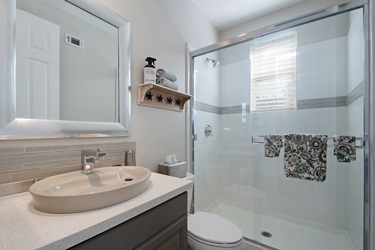- Oversized shower with heated shaving mirror, stone bench, and dual shower heads.