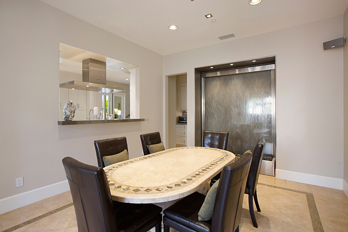 - Dining room anchored by an 8′ stainless steel & glass waterfall statement piece.