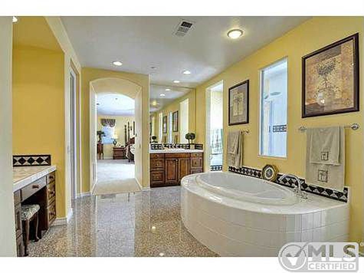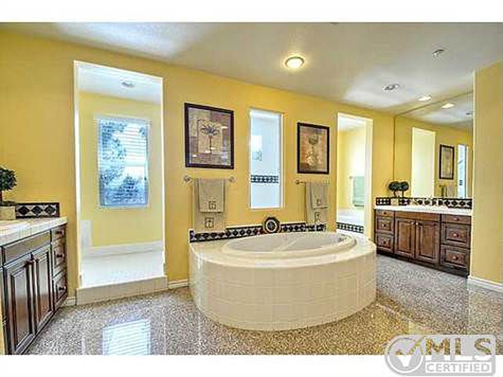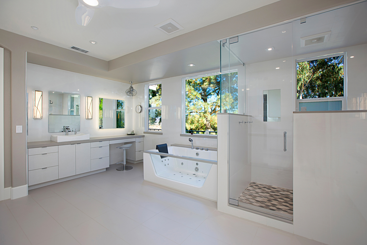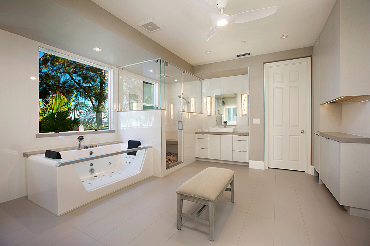 - Spa-inspired bath with jetted tub featuring underwater music, hidden refrigerator, motion-activated exhaust fans, custom cabinetry, floor-to-ceiling porcelain tile, and Sonneman Haiku lighting.